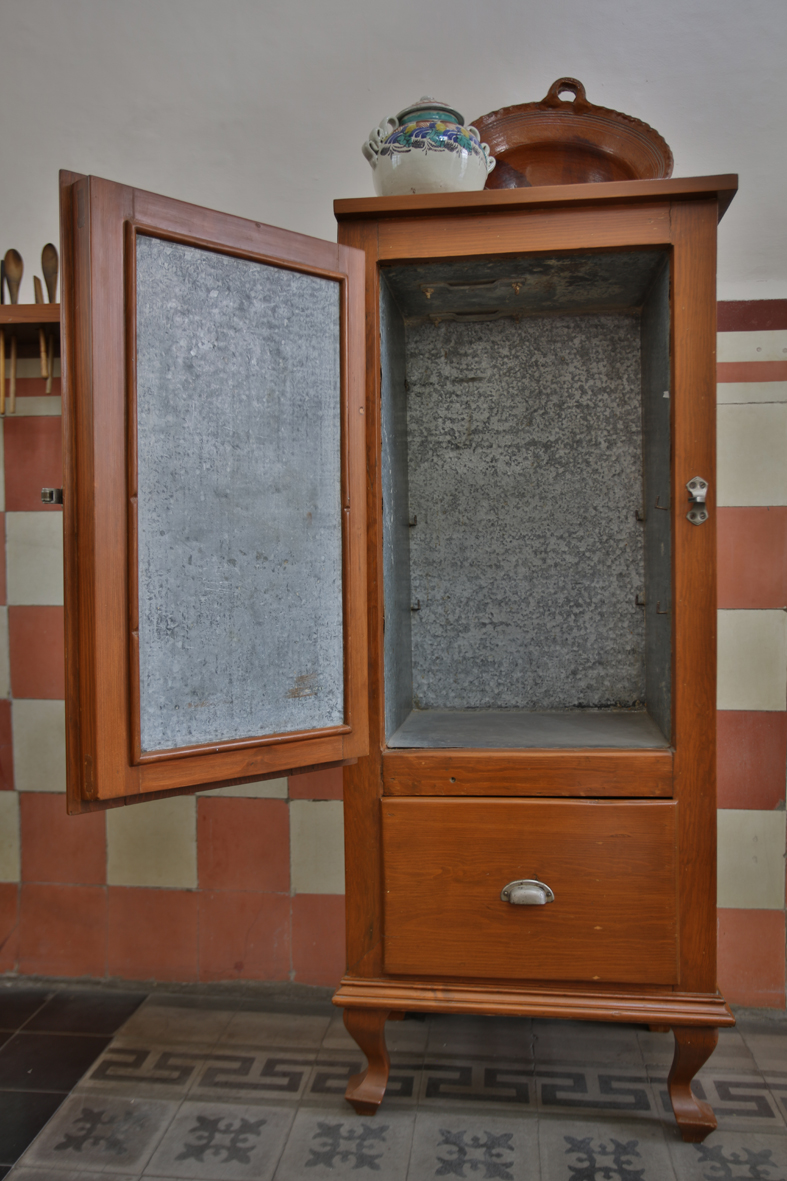 Refrigerador antiguo de madera, usado a inicios del siglo XX para conservar alimentos con hielo en su cajón inferior. Refleja los hábitos domésticos y avances tecnológicos de la época.